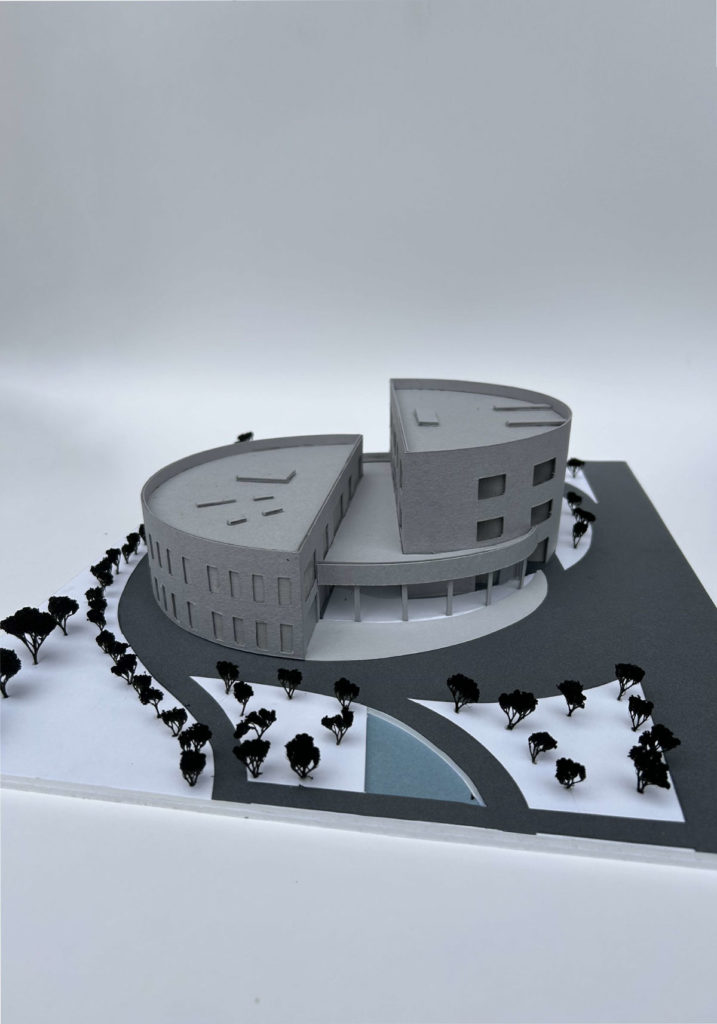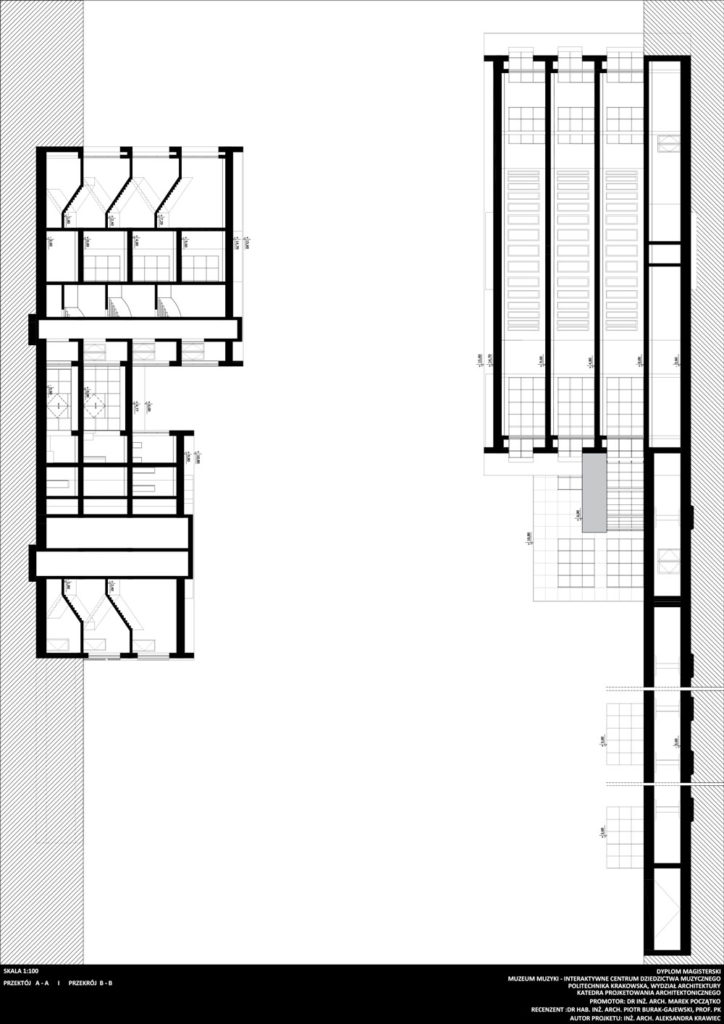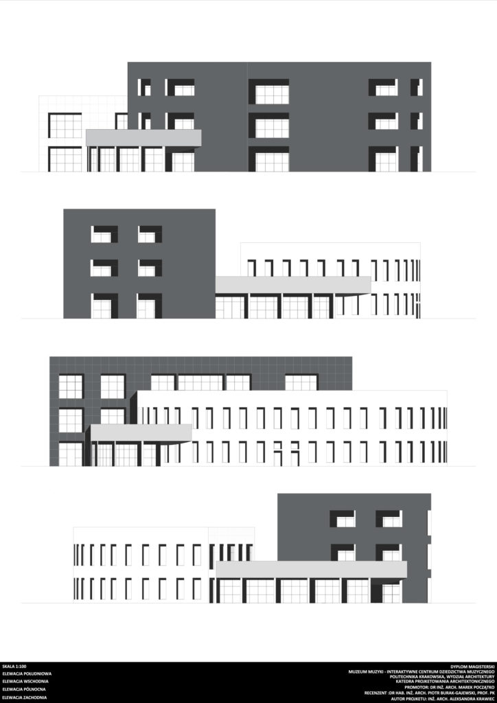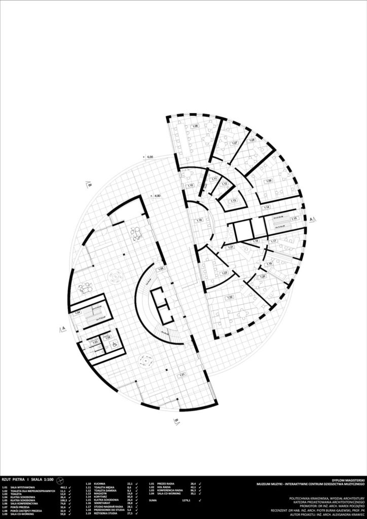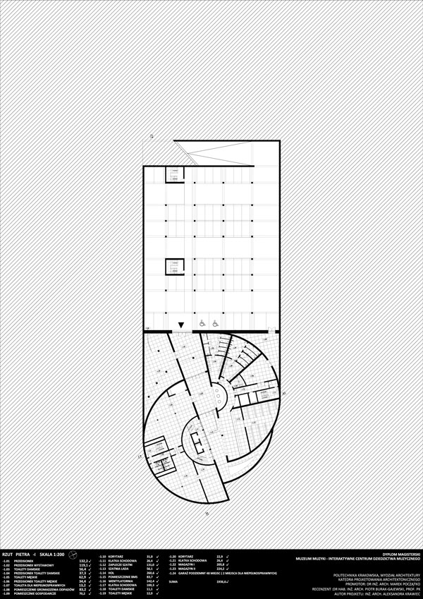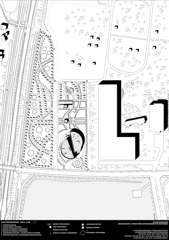 Opis idei: Projekt Muzeum Muzyki – Interaktywne Centrum Dziedzictwa Muzycznego. Ma na celu połącznie technologii sztuki i historii w jednej przestrzeni. Projekt swoją funkcja uzupełnia powstałe niedawno Krakowskie Centrum Muzyki. W rzucie parteru budynek przypominać ma swoim kształtem nutę, składająca się z dwóch walców o takiej samej powierzchni jednym niższym drugim wyższym połączonym łącznikiem co pozwala na zrozumiałe wydzielenie powierzchni wystawowych, reprezentacyjnych, warsztatowych oraz administracyjnych. Wejścia do budynku możliwe od strony wschodniej oraz zachodniej prowadzą do łącznika komunikacyjnego z przestrzeniami wypoczynkowymi, dostępem do kas, sali warsztatowych oraz kawiarni. Po zakupieni biletu odwiedzający udaje się do piony komunikacyjnego gdzie ma możliwość skorzystania szatni oraz sanitariatów zlokalizowanych na kondygnacji podziemnej lub bezpośrednio przemieścić się na ostatnią kondygnacje za pośrednictwem reprezentacyjnej klatki schodowej lub wind. Gdzie zaczyna zwiedzanie wystawy, Zwiedzający zabrany zostaje w podróż od przeszłości do współczesności muzyki po przez eksponaty i interaktywne wystawy przemieszczając się w dół kondygnacji. Na pierwszym piętrze ma on dostęp do tarasu widokowego ulokowanego nad bryłą łącznik, skąd rozpościera się widok na panoramę Krakowa z błoniami na pierwszym planie w kierunku Starego Miasta oraz Wawelu. Z drugiej strony tarasu może zobaczyć nowoprojektowaną przestrzeń zieloną z zewnętrzną wystawa eksponatów muzyki zaklętej w rzeźbie i parku doświadczeń w oddali widząc kopiec Kościuszki. Zwiedzanie wystawy zakończone jest sklepikiem muzealnym z rękodziełami lokalnych artystów. Druga część bryły z dwiema kondygnacjami nadziemnymi na parterze posiada kawiarni wraz z potrzebnym zapleczem oraz dużą sale warsztatową która może zostaw wykorzystana pod wystawy tymczasowe lub wernisaże. Na drugim poziomie znajdziemy pomieszczenia administracyjne oraz przestrzeń przygotowaną pod pracownie audiowizualną, wraz koniecznymi pomieszczeniami pomocniczymi. Kondygnacja podziemna znajduje się pod całym budynkiem oprócz wcześniej wspomnianych szatni oraz sanitariatów znajdziemy tam pomieszczania techniczne oraz magazyny. Mamy także dostęp do parkingu podziemnego, który posiada dodatkowe wyjścia bezpośrednio z parku. Przestrzeń zielona w okuł budynku z ścieżkami przypominającymi pięciolinie gdzie znajdują się eksponaty tworzące muzykę dziki zjawiskom atmosferycznym.