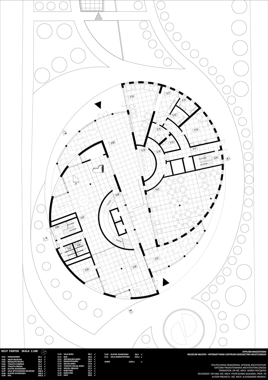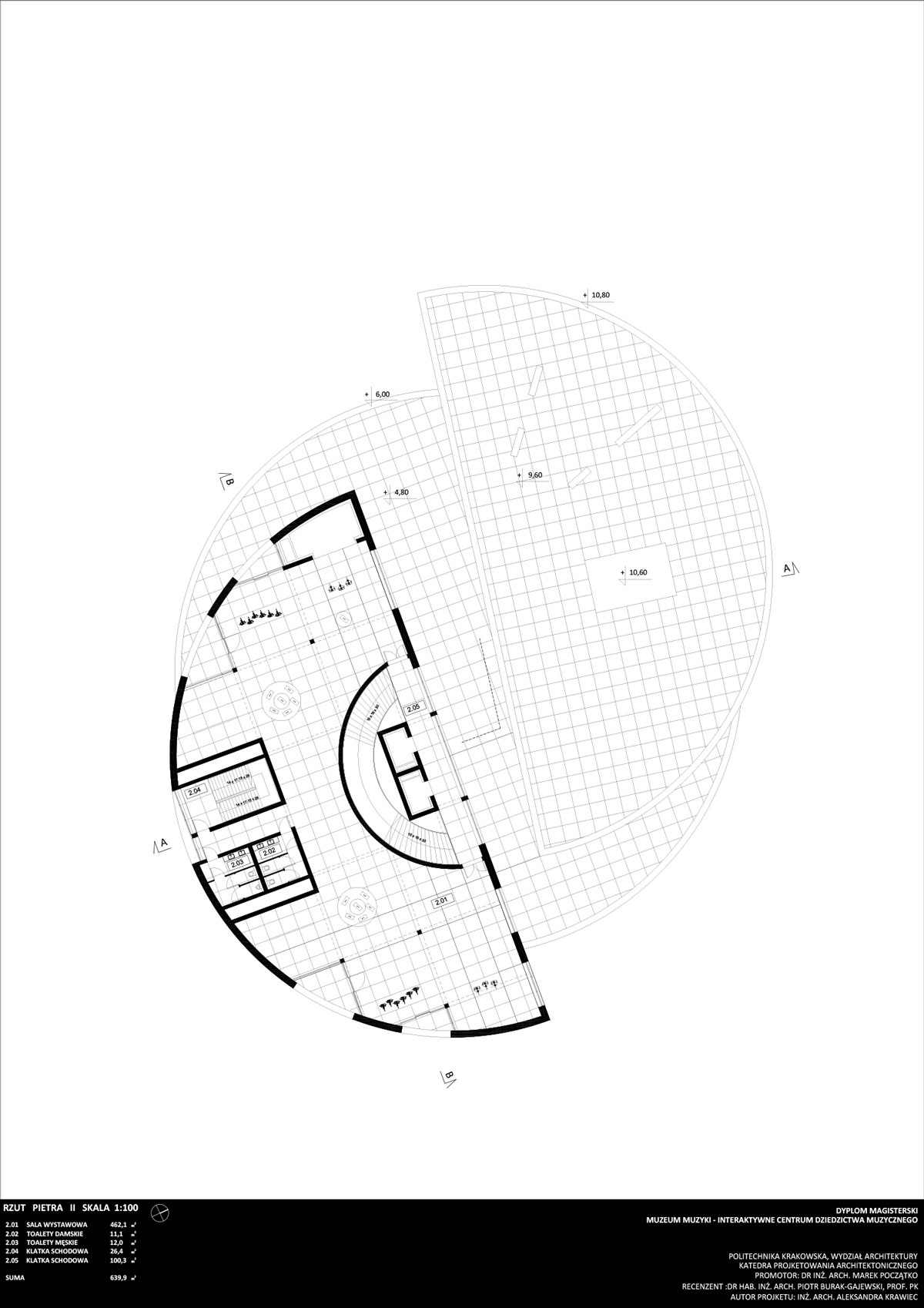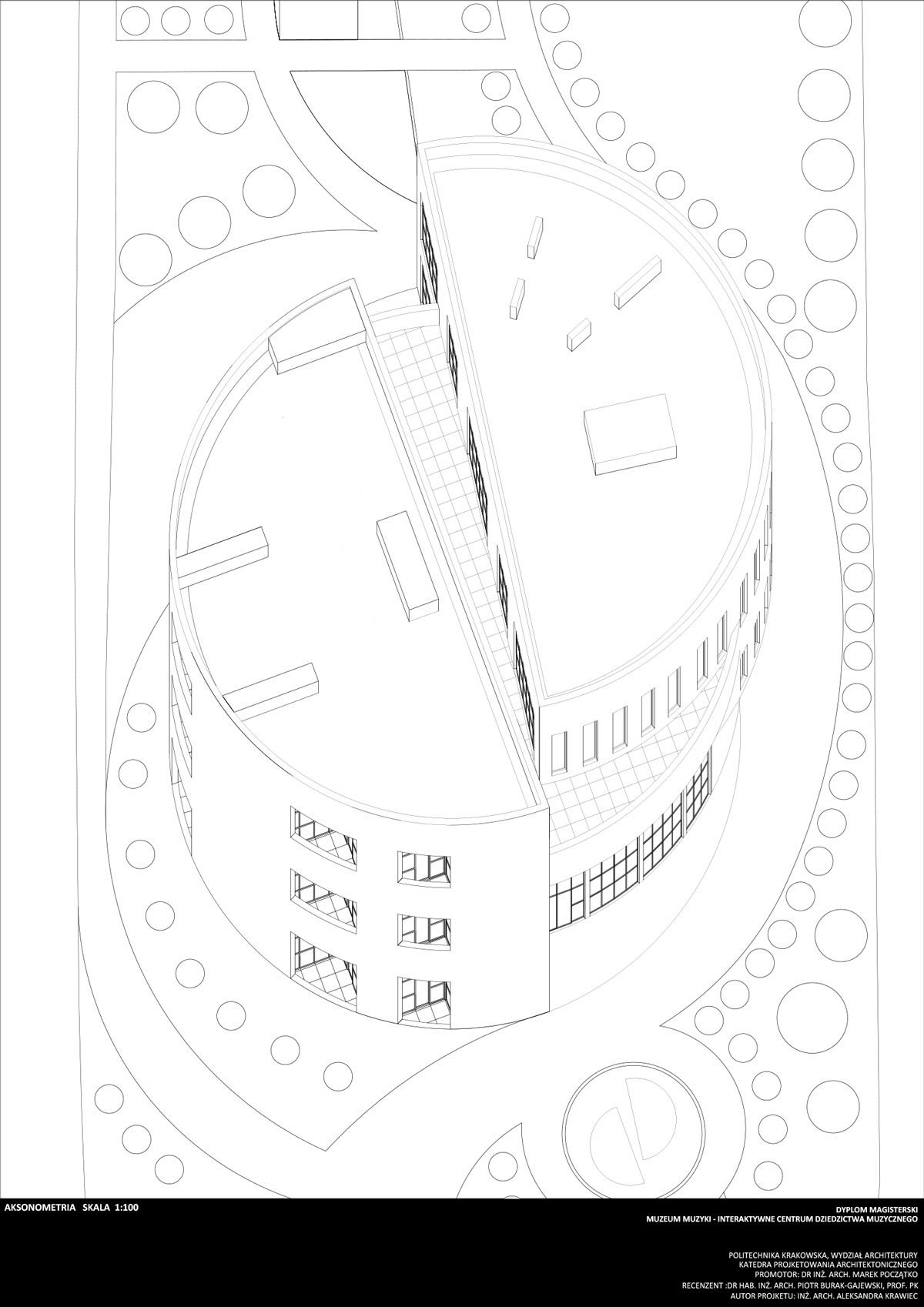 Opis idei: Projekt Muzeum Muzyki – Interaktywne Centrum Dziedzictwa Muzycznego. Ma na celu połącznie technologii sztuki i historii w jednej przestrzeni. Projekt swoją funkcja uzupełnia powstałe niedawno Krakowskie Centrum Muzyki. W rzucie parteru budynek przypominać ma swoim kształtem nutę, składająca się z dwóch walców o takiej samej powierzchni jednym niższym drugim wyższym połączonym łącznikiem co pozwala na zrozumiałe wydzielenie powierzchni wystawowych, reprezentacyjnych, warsztatowych oraz administracyjnych. Wejścia do budynku możliwe od strony wschodniej oraz zachodniej prowadzą do łącznika komunikacyjnego z przestrzeniami wypoczynkowymi, dostępem do kas, sali warsztatowych oraz kawiarni. Po zakupieni biletu odwiedzający udaje się do piony komunikacyjnego gdzie ma możliwość skorzystania szatni oraz sanitariatów zlokalizowanych na kondygnacji podziemnej lub bezpośrednio przemieścić się na ostatnią kondygnacje za pośrednictwem reprezentacyjnej klatki schodowej lub wind. Gdzie zaczyna zwiedzanie wystawy, Zwiedzający zabrany zostaje w podróż od przeszłości do współczesności muzyki po przez eksponaty i interaktywne wystawy przemieszczając się w dół kondygnacji. Na pierwszym piętrze ma on dostęp do tarasu widokowego ulokowanego nad bryłą łącznik, skąd rozpościera się widok na panoramę Krakowa z błoniami na pierwszym planie w kierunku Starego Miasta oraz Wawelu. Z drugiej strony tarasu może zobaczyć nowoprojektowaną przestrzeń zieloną z zewnętrzną wystawa eksponatów muzyki zaklętej w rzeźbie i parku doświadczeń w oddali widząc kopiec Kościuszki. Zwiedzanie wystawy zakończone jest sklepikiem muzealnym z rękodziełami lokalnych artystów. Druga część bryły z dwiema kondygnacjami nadziemnymi na parterze posiada kawiarni wraz z potrzebnym zapleczem oraz dużą sale warsztatową która może zostaw wykorzystana pod wystawy tymczasowe lub wernisaże. Na drugim poziomie znajdziemy pomieszczenia administracyjne oraz przestrzeń przygotowaną pod pracownie audiowizualną, wraz koniecznymi pomieszczeniami pomocniczymi. Kondygnacja podziemna znajduje się pod całym budynkiem oprócz wcześniej wspomnianych szatni oraz sanitariatów znajdziemy tam pomieszczania techniczne oraz magazyny. Mamy także dostęp do parkingu podziemnego, który posiada dodatkowe wyjścia bezpośrednio z parku. Przestrzeń zielona w okuł budynku z ścieżkami przypominającymi pięciolinie gdzie znajdują się eksponaty tworzące muzykę dziki zjawiskom atmosferycznym.