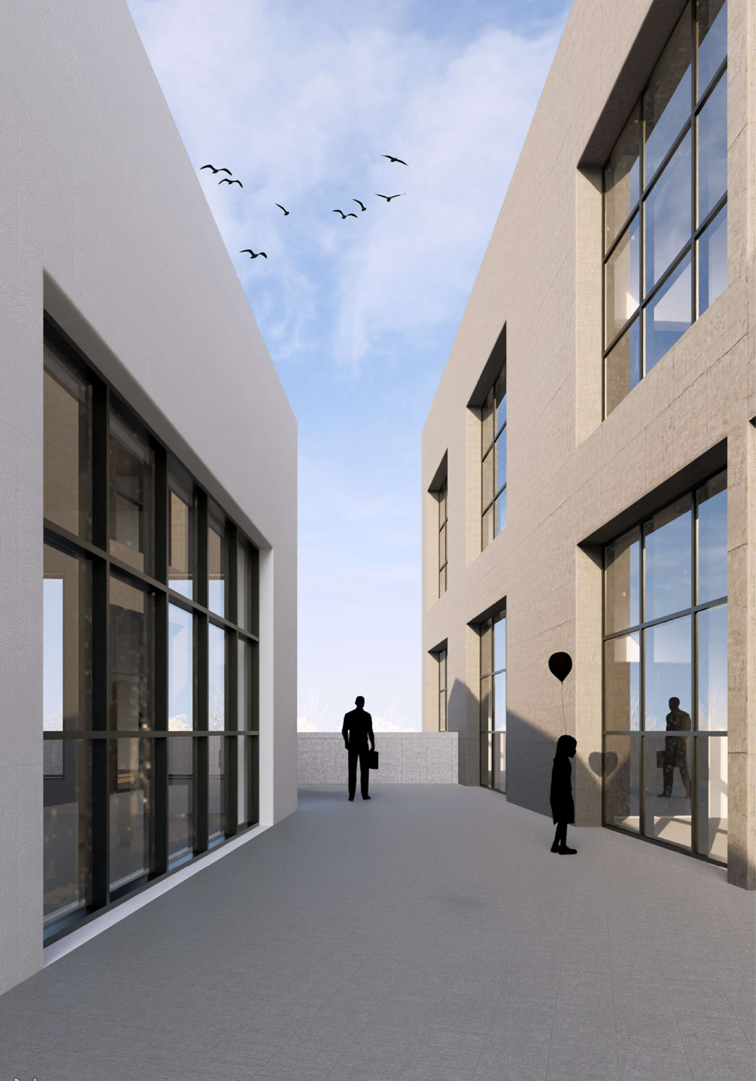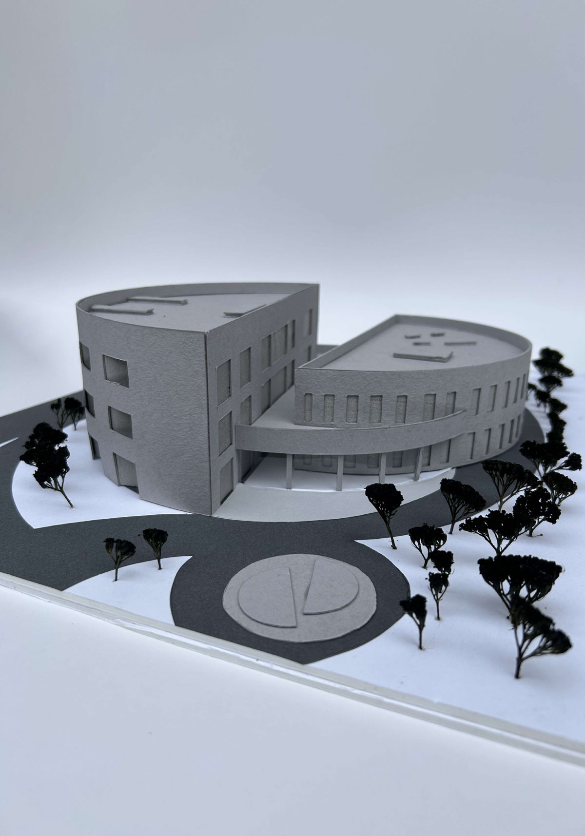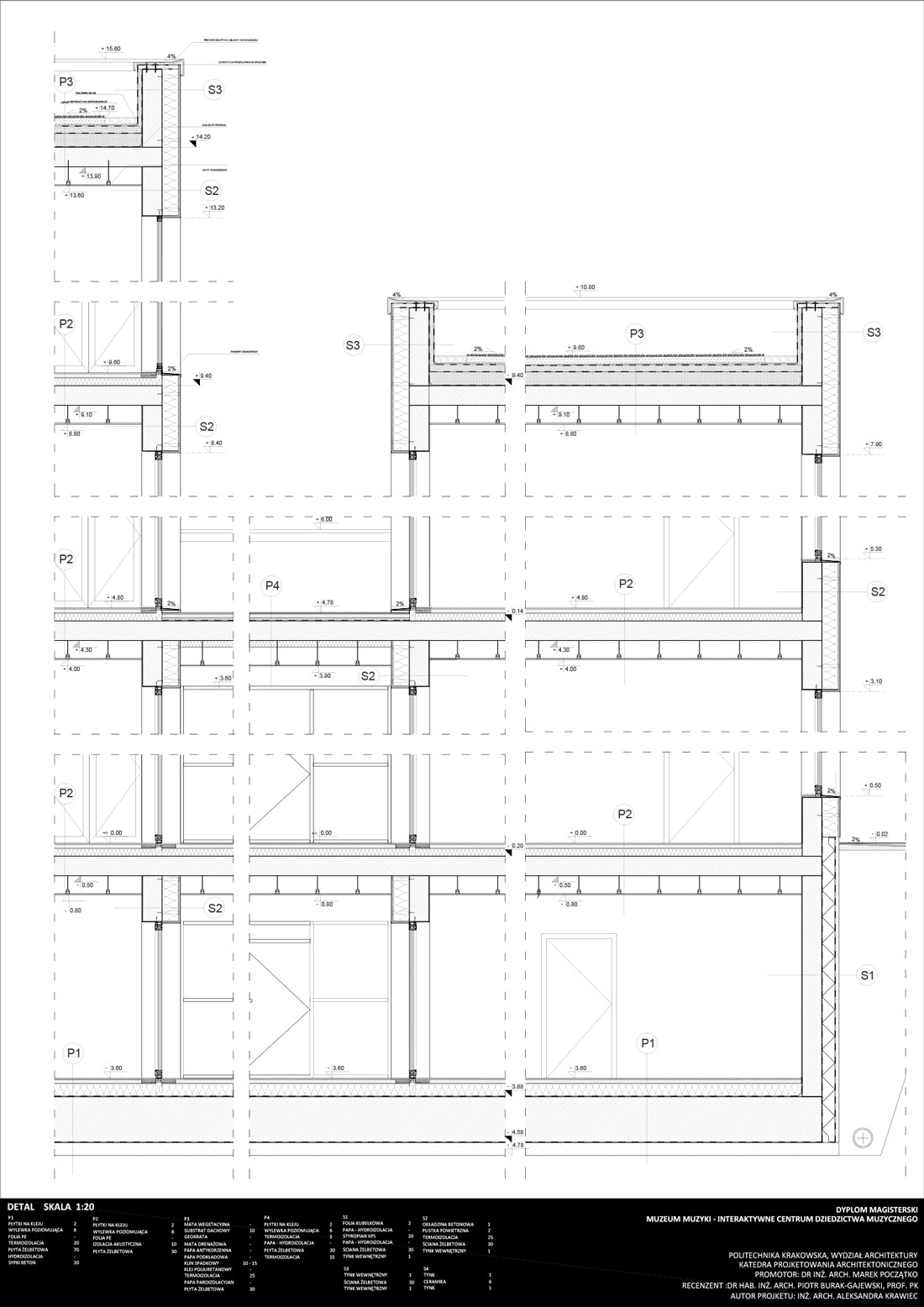 Opis idei: Projekt Muzeum Muzyki – Interaktywne Centrum Dziedzictwa Muzycznego. Ma na celu połącznie technologii sztuki i historii w jednej przestrzeni. Projekt swoją funkcja uzupełnia powstałe niedawno Krakowskie Centrum Muzyki. W rzucie parteru budynek przypominać ma swoim kształtem nutę, składająca się z dwóch walców o takiej samej powierzchni jednym niższym drugim wyższym połączonym łącznikiem co pozwala na zrozumiałe wydzielenie powierzchni wystawowych, reprezentacyjnych, warsztatowych oraz administracyjnych. Wejścia do budynku możliwe od strony wschodniej oraz zachodniej prowadzą do łącznika komunikacyjnego z przestrzeniami wypoczynkowymi, dostępem do kas, sali warsztatowych oraz kawiarni. Po zakupieni biletu odwiedzający udaje się do piony komunikacyjnego gdzie ma możliwość skorzystania szatni oraz sanitariatów zlokalizowanych na kondygnacji podziemnej lub bezpośrednio przemieścić się na ostatnią kondygnacje za pośrednictwem reprezentacyjnej klatki schodowej lub wind. Gdzie zaczyna zwiedzanie wystawy, Zwiedzający zabrany zostaje w podróż od przeszłości do współczesności muzyki po przez eksponaty i interaktywne wystawy przemieszczając się w dół kondygnacji. Na pierwszym piętrze ma on dostęp do tarasu widokowego ulokowanego nad bryłą łącznik, skąd rozpościera się widok na panoramę Krakowa z błoniami na pierwszym planie w kierunku Starego Miasta oraz Wawelu. Z drugiej strony tarasu może zobaczyć nowoprojektowaną przestrzeń zieloną z zewnętrzną wystawa eksponatów muzyki zaklętej w rzeźbie i parku doświadczeń w oddali widząc kopiec Kościuszki. Zwiedzanie wystawy zakończone jest sklepikiem muzealnym z rękodziełami lokalnych artystów. Druga część bryły z dwiema kondygnacjami nadziemnymi na parterze posiada kawiarni wraz z potrzebnym zapleczem oraz dużą sale warsztatową która może zostaw wykorzystana pod wystawy tymczasowe lub wernisaże. Na drugim poziomie znajdziemy pomieszczenia administracyjne oraz przestrzeń przygotowaną pod pracownie audiowizualną, wraz koniecznymi pomieszczeniami pomocniczymi. Kondygnacja podziemna znajduje się pod całym budynkiem oprócz wcześniej wspomnianych szatni oraz sanitariatów znajdziemy tam pomieszczania techniczne oraz magazyny. Mamy także dostęp do parkingu podziemnego, który posiada dodatkowe wyjścia bezpośrednio z parku. Przestrzeń zielona w okuł budynku z ścieżkami przypominającymi pięciolinie gdzie znajdują się eksponaty tworzące muzykę dziki zjawiskom atmosferycznym.