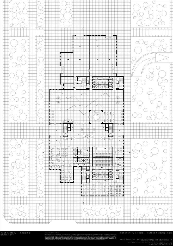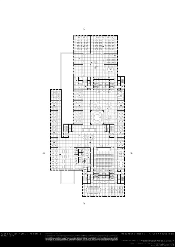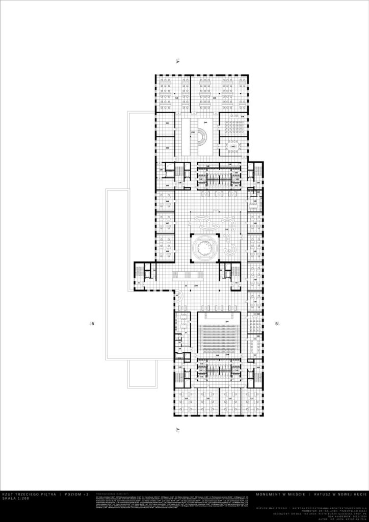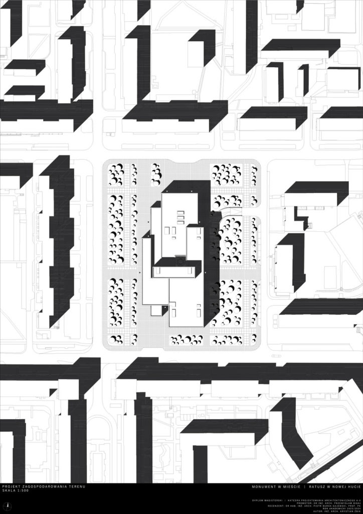 Opis idei: Budynek zaprojektowany został na wysokość 7 kondygnacji. Charakteryzuje go wysunięta wieża stanowiąca akcent w przestrzeni. Działka projektowa znajduje się w XVIII dzielnicy Krakowa – Nowa Huta. W jej otoczeniu znajdują się liczne zabudowania mieszkaniowo-usługowe, szkoła oraz zieleń wysoka. W procesie projektowym istotnym było utworzenie miejskiego monumentu estetycznie wkomponowanego w otoczenie oraz realizacja określonego programu. Układ funkcjonalny poza funkcjami administracyjnymi przewiduje również wspólne przestrzenie przeznaczone do użytku publicznego, przestrzenie wystawowe oraz dwupoziomową dużą kawiarnię. W parterze umieszczone zostały lokale usługowe. Projekt przewidział również umieszczenie dwóch dużych sal audytoryjnych biegnących łącznie przez cztery piętra oraz pomieszczenia biurowe z możliwością wynajęcia. Docelowo obiekt poza pełnieniem funkcji jaką jest siedziba Urzędu Miasta, ma stać się pretekstem do nowych aktywności społecznych i kulturalnych. Dzięki dużym otwartym przestrzeniom projekt wprowadza nową jakość w istniejącą tkankę miejską i początkuje wzrost kultury i jakości tego miejsca.