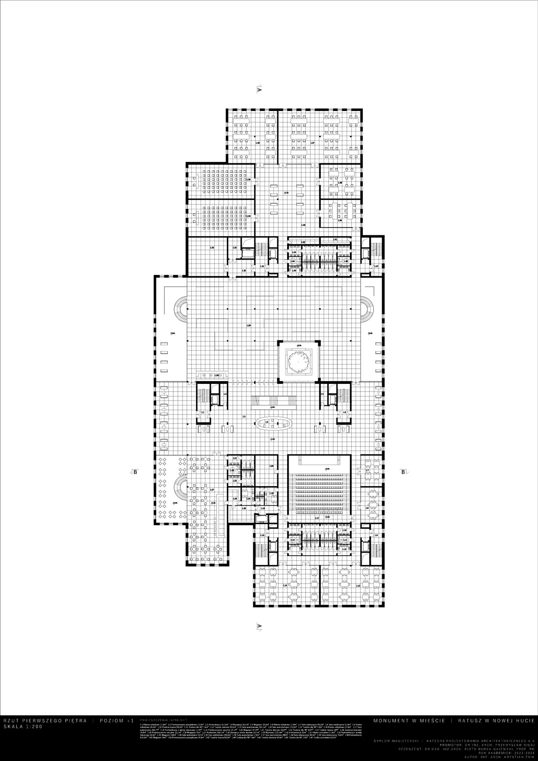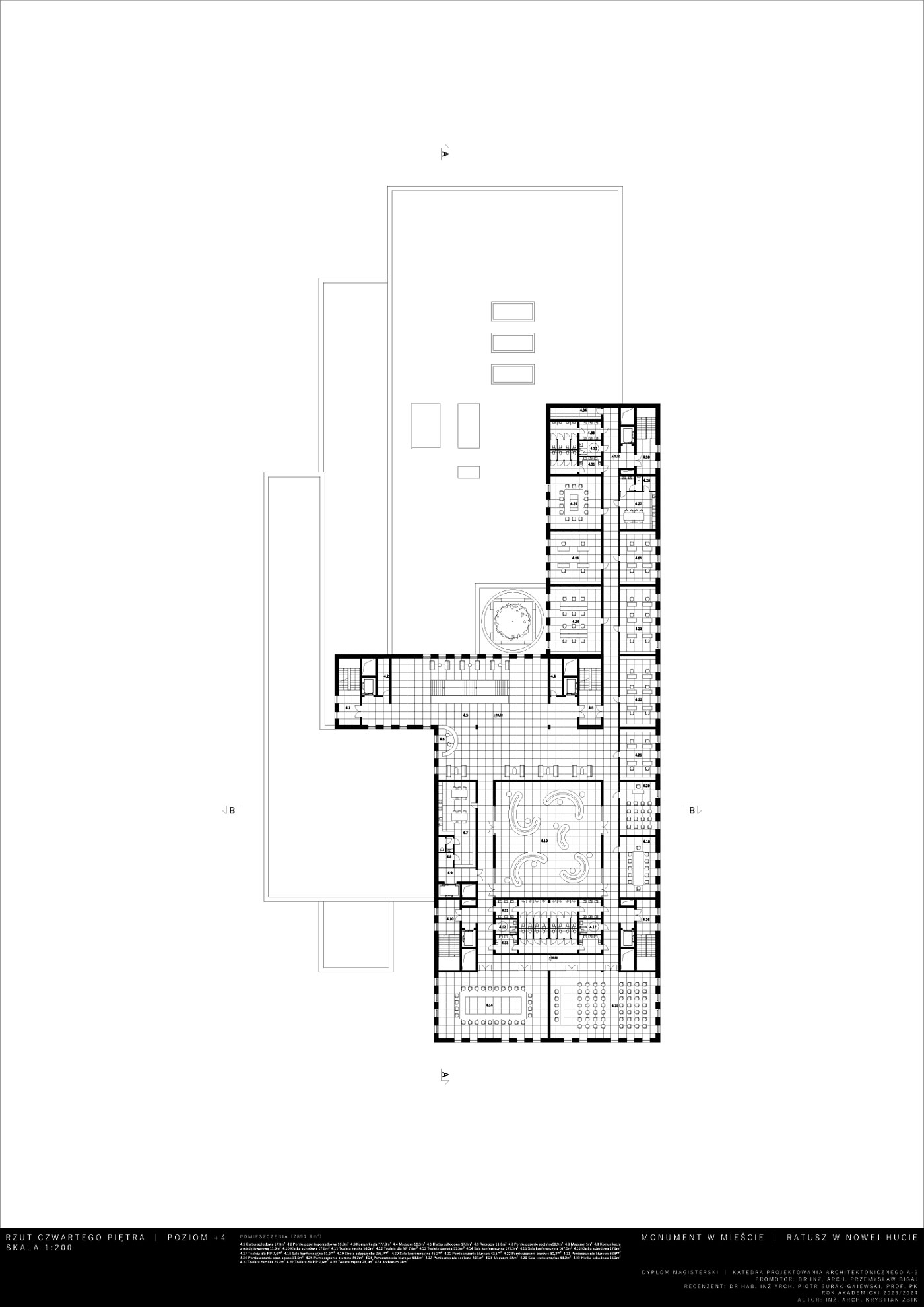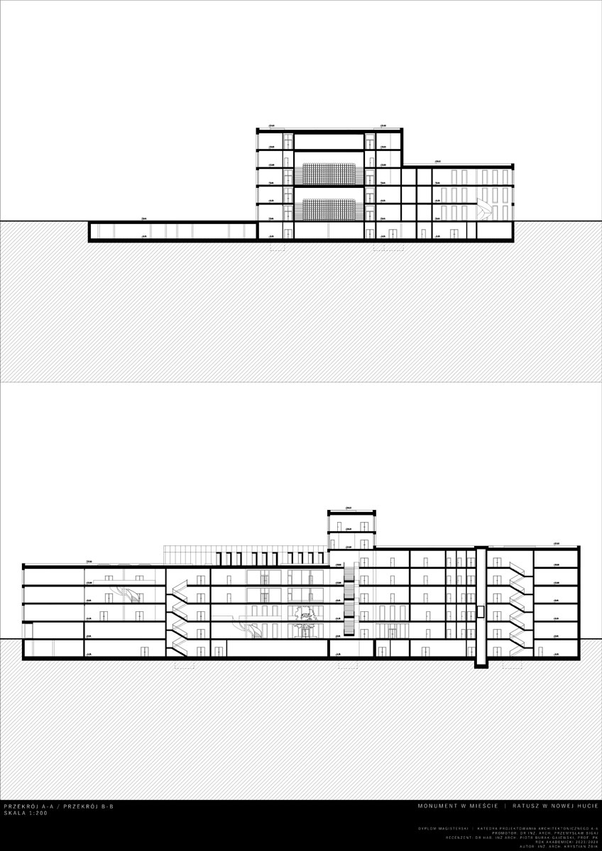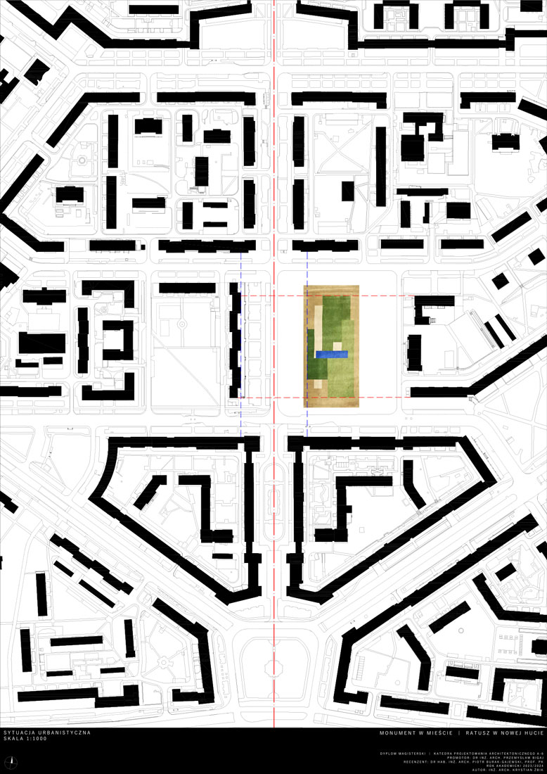 Opis idei: Budynek zaprojektowany został na wysokość 7 kondygnacji. Charakteryzuje go wysunięta wieża stanowiąca akcent w przestrzeni. Działka projektowa znajduje się w XVIII dzielnicy Krakowa – Nowa Huta. W jej otoczeniu znajdują się liczne zabudowania mieszkaniowo-usługowe, szkoła oraz zieleń wysoka. W procesie projektowym istotnym było utworzenie miejskiego monumentu estetycznie wkomponowanego w otoczenie oraz realizacja określonego programu. Układ funkcjonalny poza funkcjami administracyjnymi przewiduje również wspólne przestrzenie przeznaczone do użytku publicznego, przestrzenie wystawowe oraz dwupoziomową dużą kawiarnię. W parterze umieszczone zostały lokale usługowe. Projekt przewidział również umieszczenie dwóch dużych sal audytoryjnych biegnących łącznie przez cztery piętra oraz pomieszczenia biurowe z możliwością wynajęcia. Docelowo obiekt poza pełnieniem funkcji jaką jest siedziba Urzędu Miasta, ma stać się pretekstem do nowych aktywności społecznych i kulturalnych. Dzięki dużym otwartym przestrzeniom projekt wprowadza nową jakość w istniejącą tkankę miejską i początkuje wzrost kultury i jakości tego miejsca.