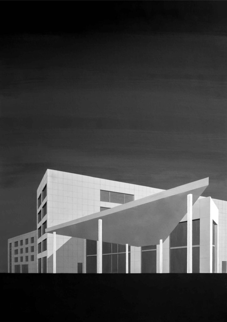 Opis idei: Celem projektu było przekształcenie wybranego dzieła malarskiego w kompozycję przestrzenną, aby mogło ono zaistnieć jako forma architektoniczna. Poszukiwania miejsca, które dałoby możliwość zrealizowania przedstawionego zagadnienia rozpoczęły się w Krakowie. Udało się odnaleźć je w centralnej części dzielnicy Podgórze – jest to obszar stale rozwijający się, który w ostatnich latach znacznie zyskał na atrakcyjności. Przyczyniła się do tego między innymi rewitalizacja zalewu Bagry, który obecnie jest miejscem rekreacji licznie odwiedzanym zarówno przez turystów jak i mieszkańców Krakowa. Inspiracja dziełem malarskim w projekcie miała być bardzo dosłowna – celem było bowiem bezpośrednie zrekonstruowanie form widocznych na obrazie tak, aby stały się one przestrzenne. Kierunkiem malarskim, który doskonale wpisuje się w założenia projektu jest stworzony przez Kazimierza Malewicza suprematyzm. Jego główną cechą było maksymalne upraszczanie przedstawianych form, co miało prowadzić do całkowitego oderwania sztuki od rzeczywistości. Malewicz w swoim stylu dążył do przedstawienia czystego, niezależnego od otoczenia odczucia. Jednym z obrazów idealnie wpisujących się w tematykę projektu jest kompozycja bez tytułu z 1916 roku. Po nadaniu kompozycji formy przestrzennej, ostatnim krokiem w projekcie pozostało nasycenie jej użytecznością. Tak jak kompozycja Malewicza składa się z wielu elementów tworzących spójną całość, tak projektowany budynek powinien łączyć w sobie wiele ról. Z tego względu wybrana została funkcja hotelarska – w obiekcie hotelowym występować powinny bowiem liczne dodatkowe funkcje, które stanowią uzupełnienie podstawowej roli noclegowej.