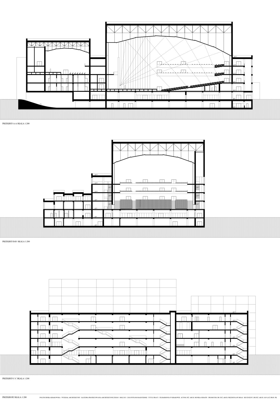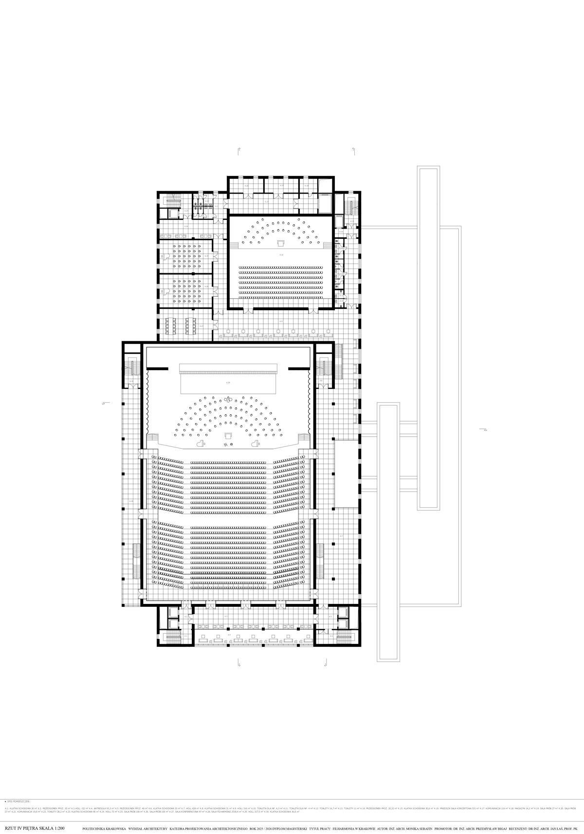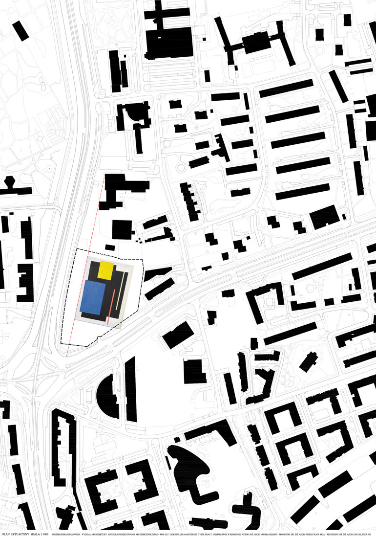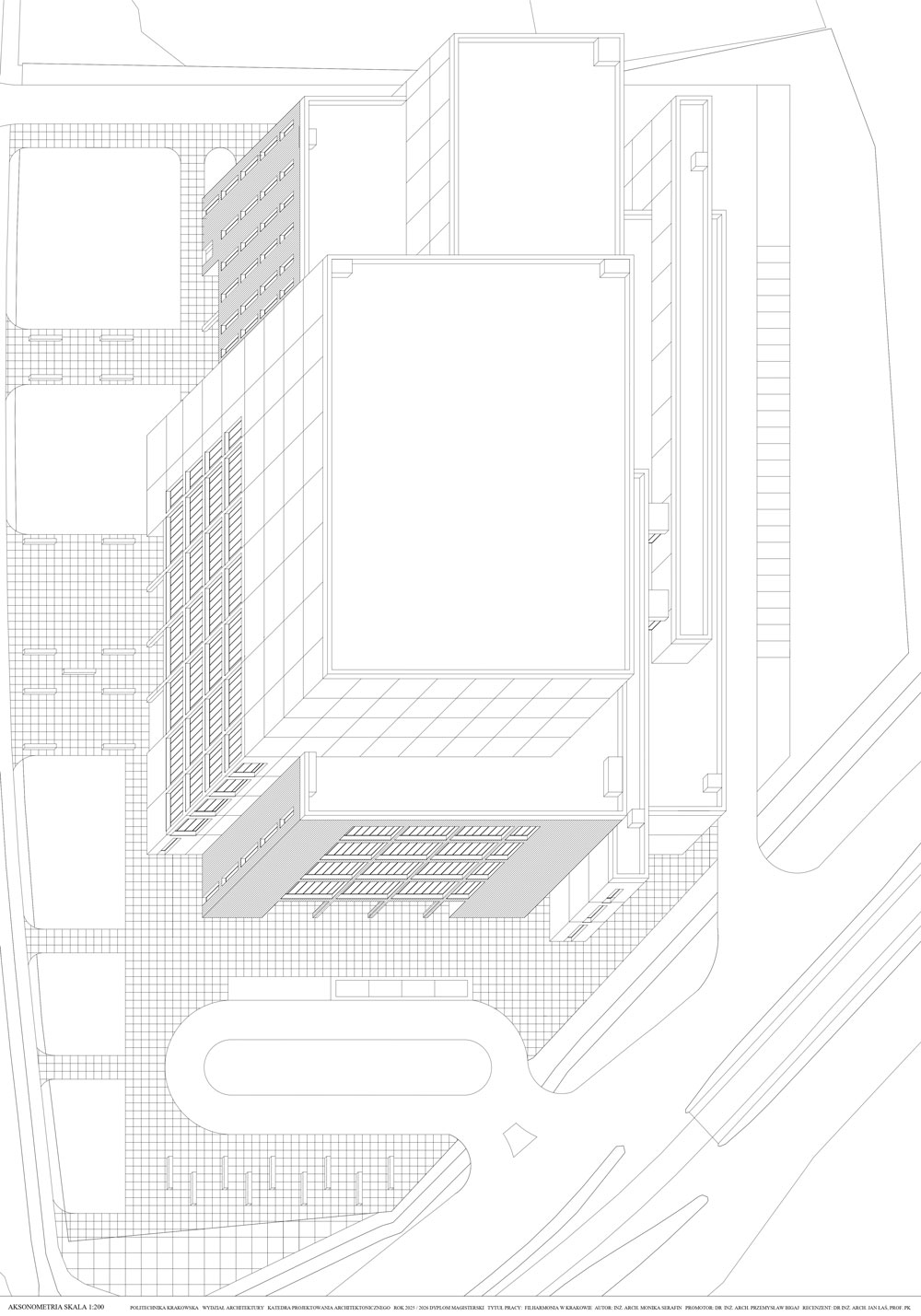 Opis idei: Przedmiotem opracowania pracy dyplomowej jest projekt budynku Filharmonii usytuowanego w miejscowości Kraków w województwie Małopolskim. Lokalizacja obiektu wpisana jest w miejski krajobraz w samym centrum miasta, która oddaje dialog budynku z dynamicznym miejskim kontekstem. Filharmonia staję się przestrzenią wyciszenia i refleksji tworząc symboliczne zatrzymanie w pędzie współczesnego świata. Głównym założeniem projektu było opracowanie koncepcji w oparciu o temat przewodni „Miejsce szuka formy, forma szuka funkcji” było to priorytetem do stworzenia bryły bazującej na obrazie Włodzimierza Pawlaka, zatytułowanym „Notatka o sztuce”. Nadając obrazowi charakter przestrzenny i ukazując jego proporcje oraz kształt powstała wpisująca się w krajobraz miejski architektoniczna kompozycja pełniąca odskocznię od pędzącego dziś miasta. Kubaturę przestrzenną płaskiemu obrazowi nadała kolorystyka brył, którym została określona odpowiednia wysokość poprzez przypisanie danej funkcji użytkowej.
