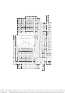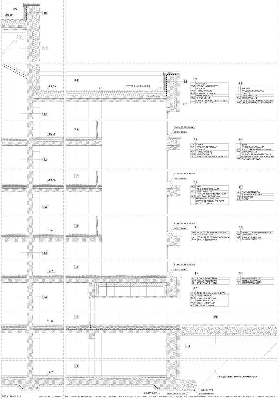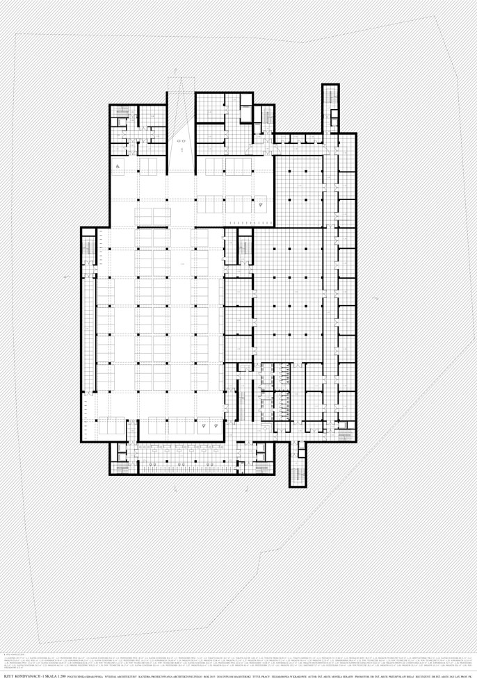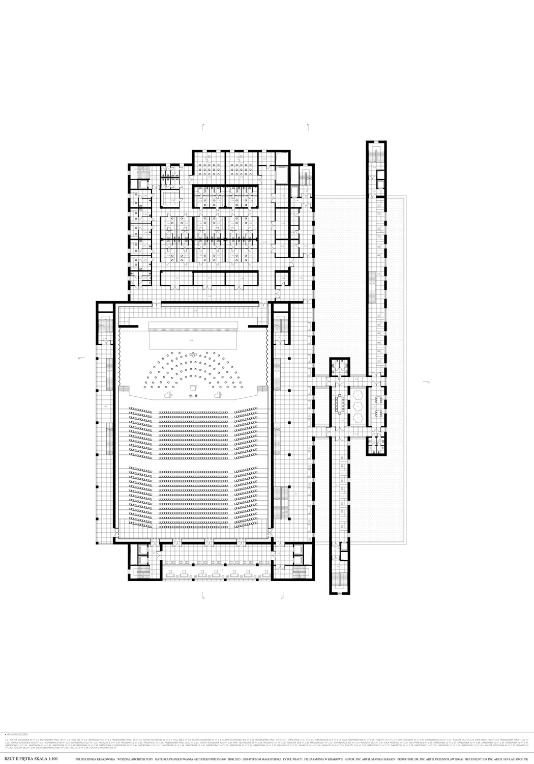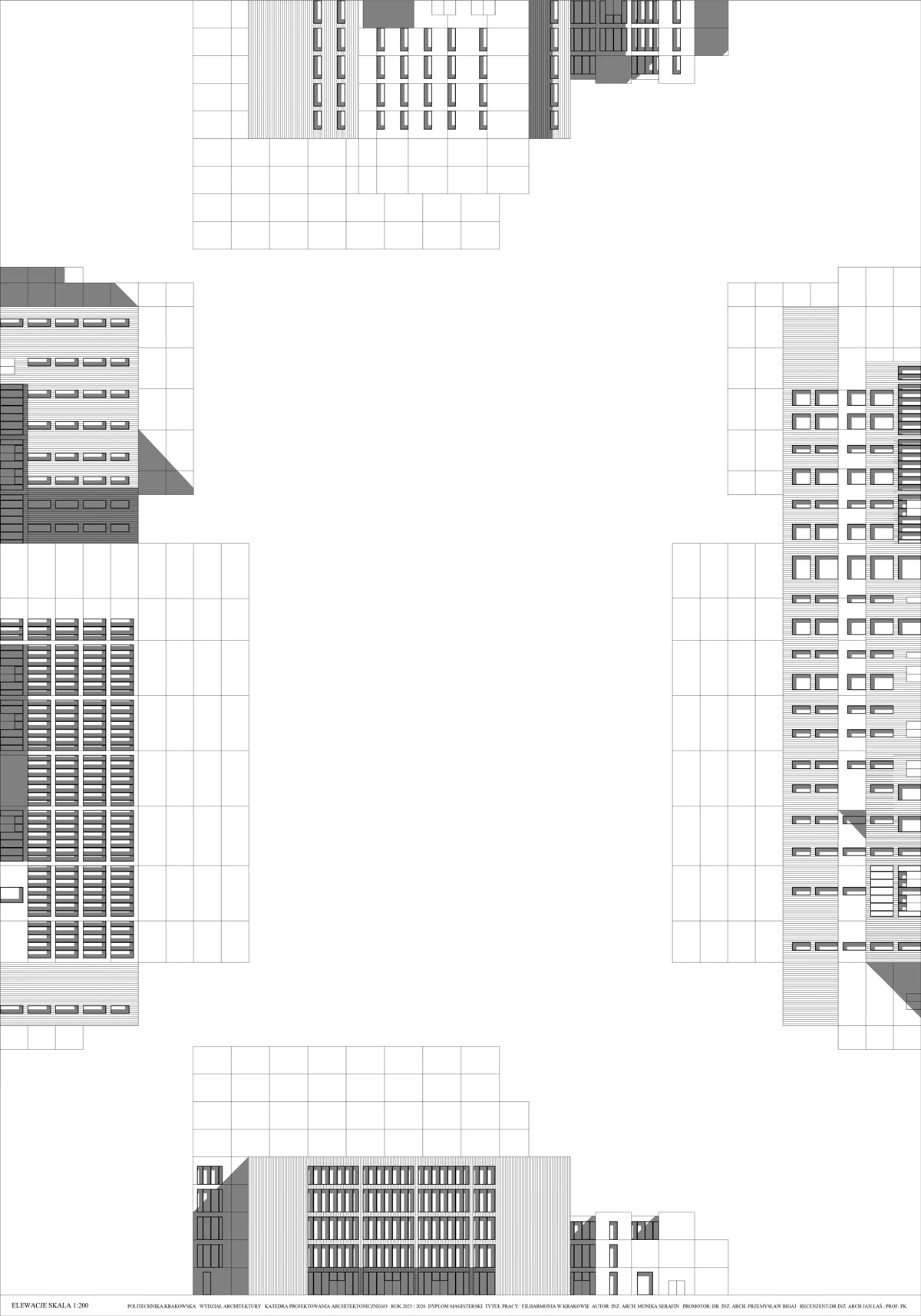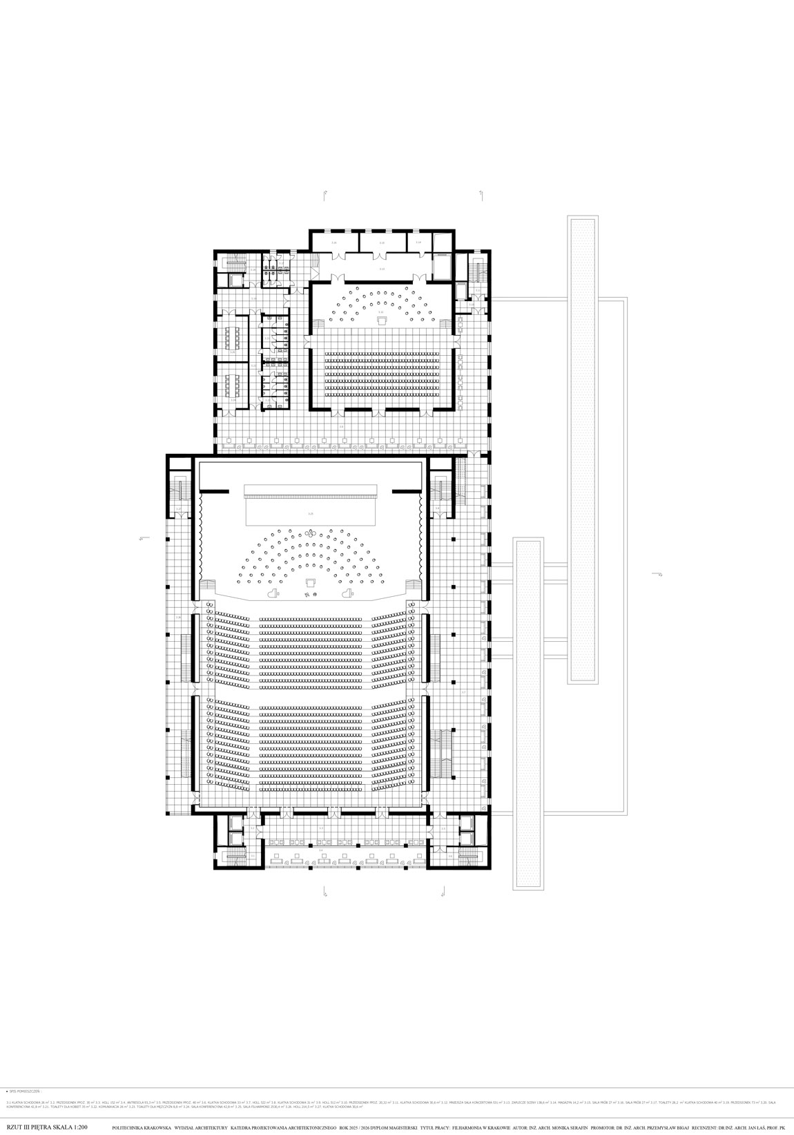 Opis idei: Przedmiotem opracowania pracy dyplomowej jest projekt budynku Filharmonii usytuowanego w miejscowości Kraków w województwie Małopolskim. Lokalizacja obiektu wpisana jest w miejski krajobraz w samym centrum miasta, która oddaje dialog budynku z dynamicznym miejskim kontekstem. Filharmonia staję się przestrzenią wyciszenia i refleksji tworząc symboliczne zatrzymanie w pędzie współczesnego świata. Głównym założeniem projektu było opracowanie koncepcji w oparciu o temat przewodni „Miejsce szuka formy, forma szuka funkcji” było to priorytetem do stworzenia bryły bazującej na obrazie Włodzimierza Pawlaka, zatytułowanym „Notatka o sztuce”. Nadając obrazowi charakter przestrzenny i ukazując jego proporcje oraz kształt powstała wpisująca się w krajobraz miejski architektoniczna kompozycja pełniąca odskocznię od pędzącego dziś miasta. Kubaturę przestrzenną płaskiemu obrazowi nadała kolorystyka brył, którym została określona odpowiednia wysokość poprzez przypisanie danej funkcji użytkowej.