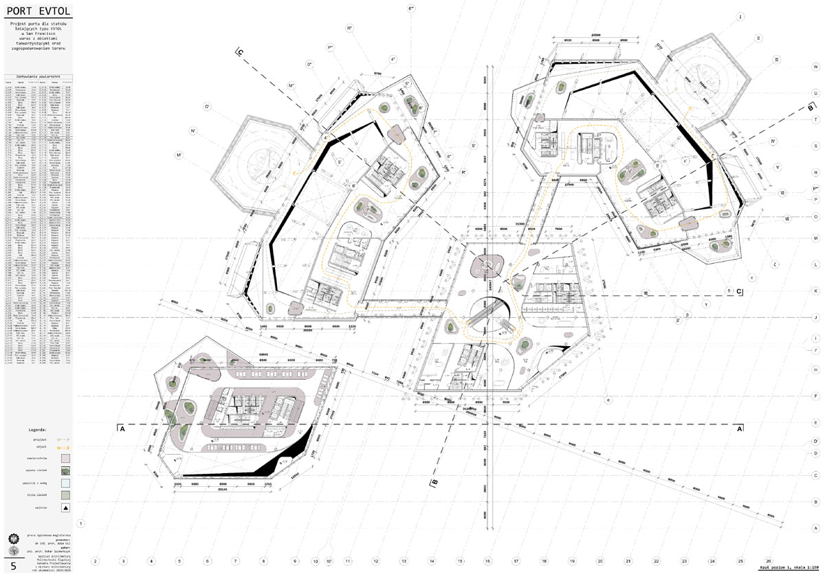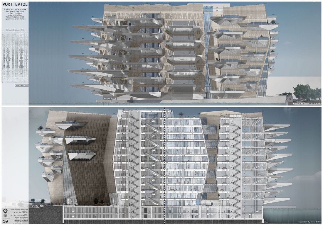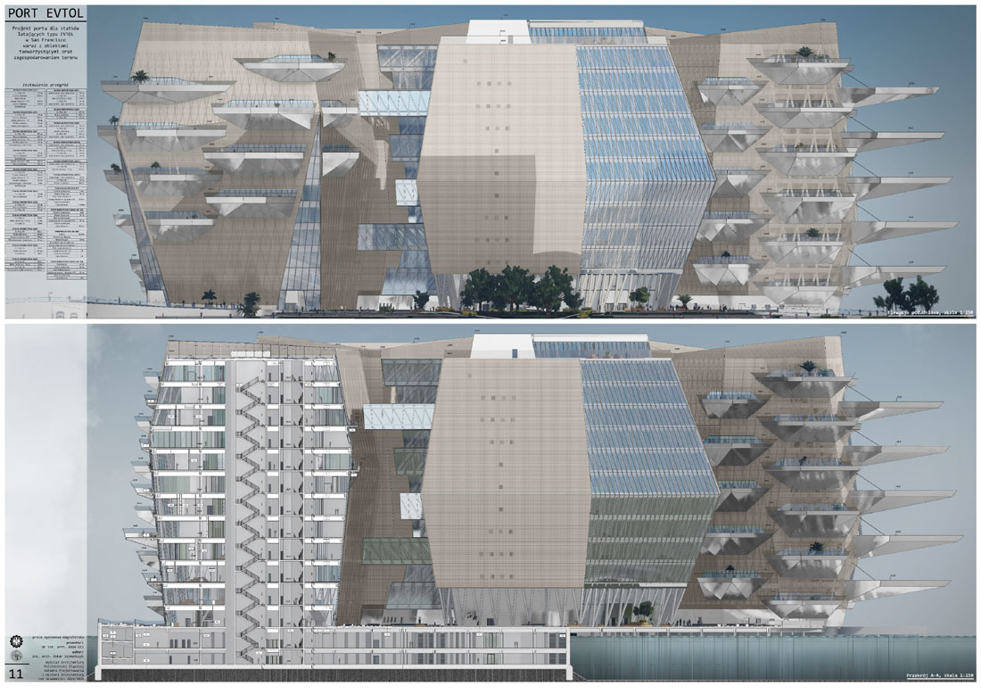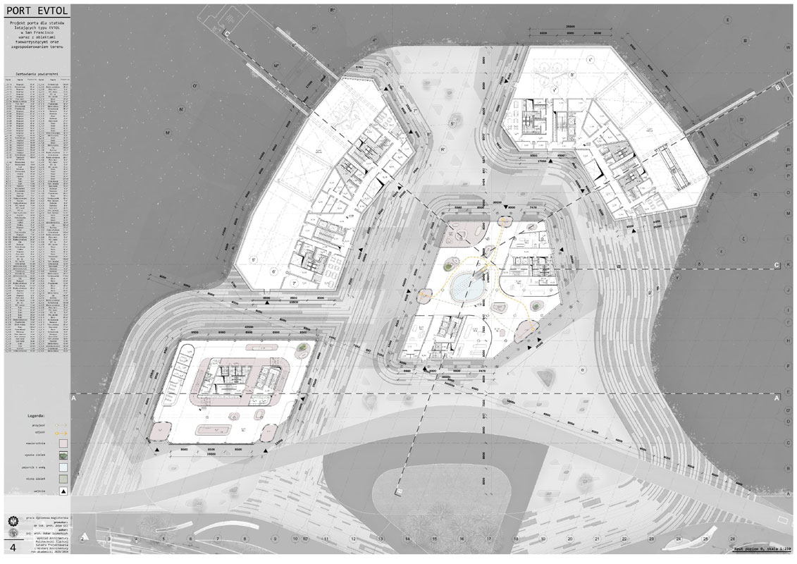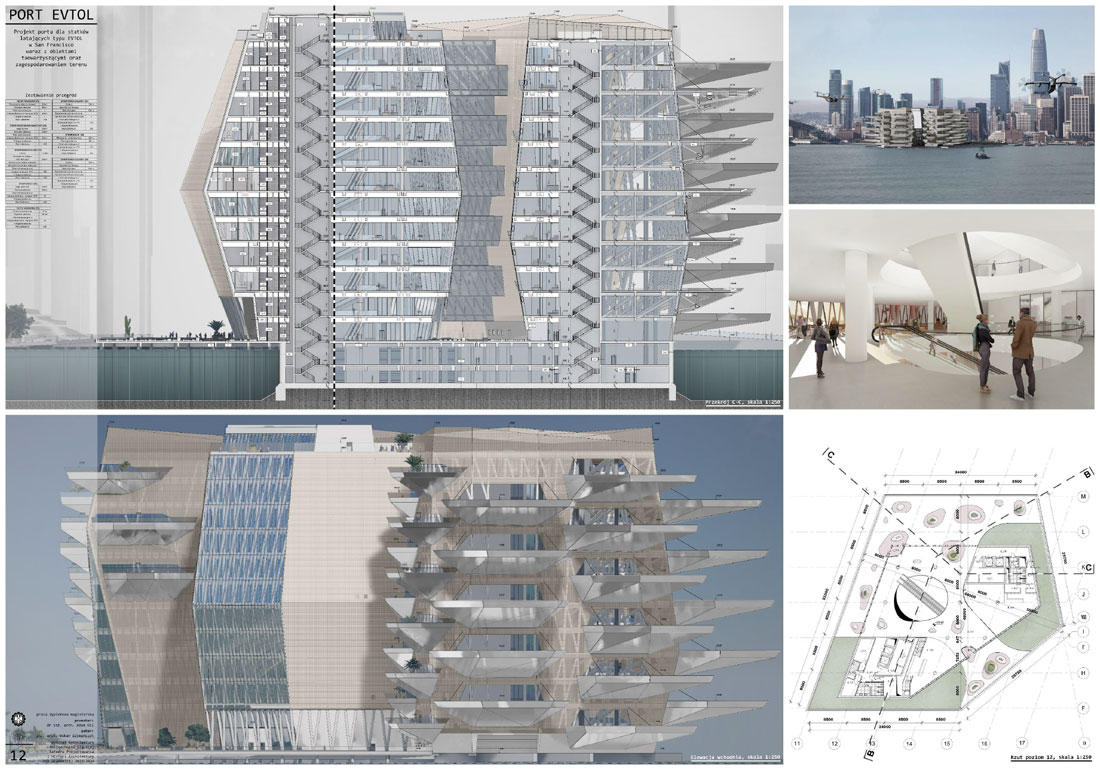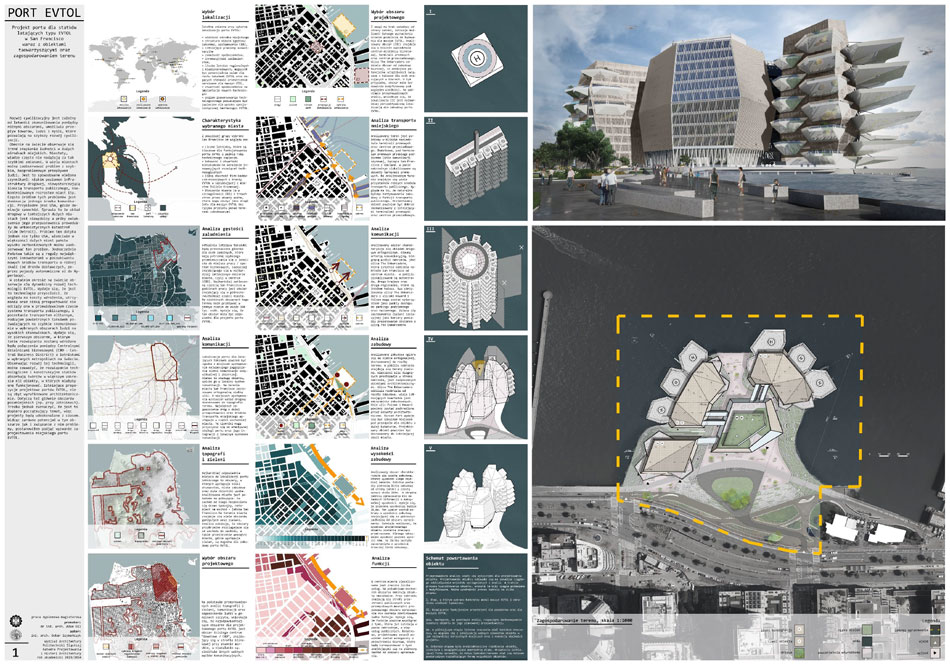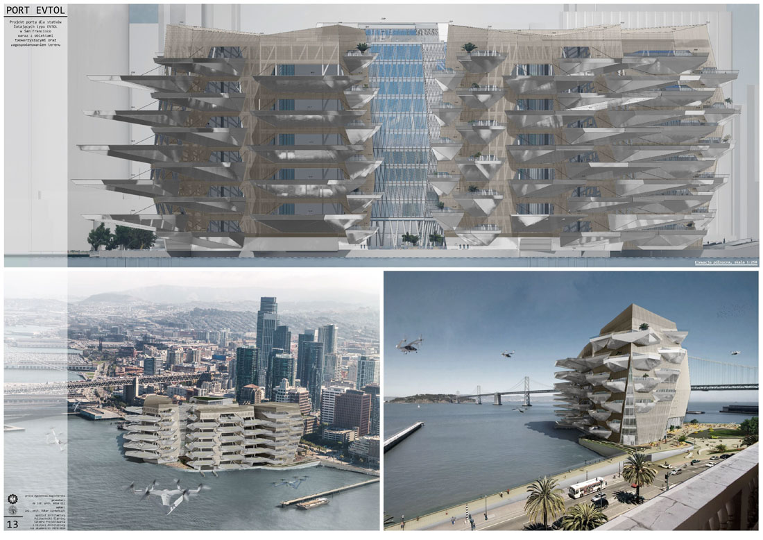 Tytuł: Projekt obiektu transportu publicznego. Portu dla statków powietrznych typu EVTOL w San Francisco wraz z obiektami towarzyszącymi oraz zagospodarowania terenu.