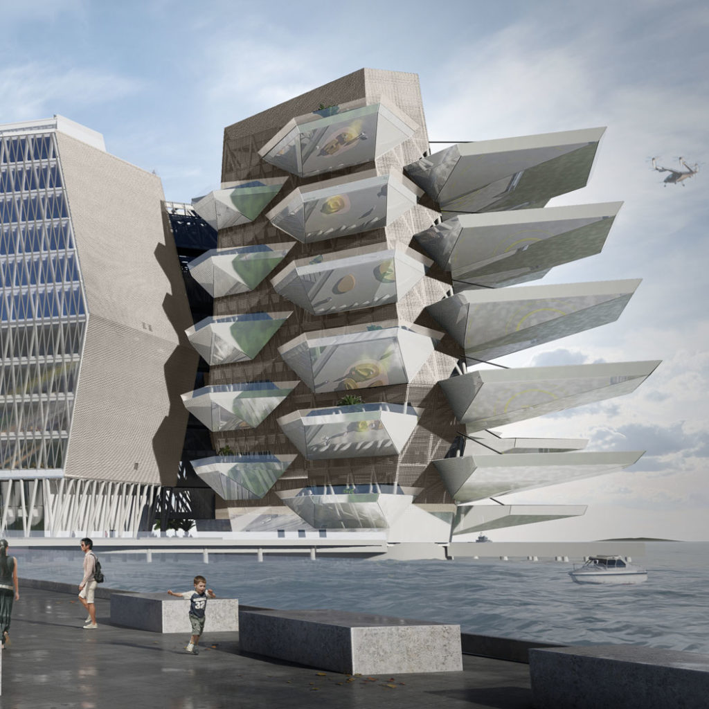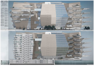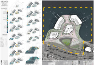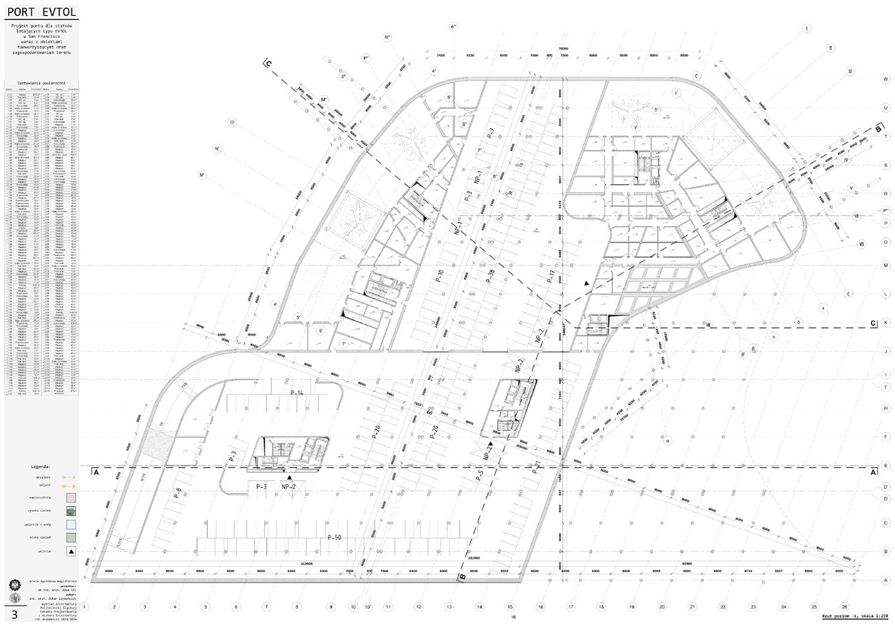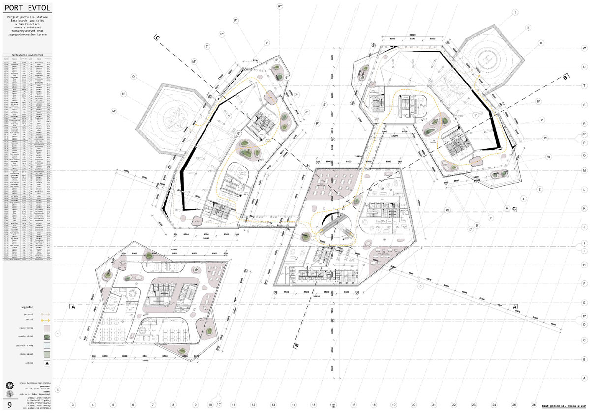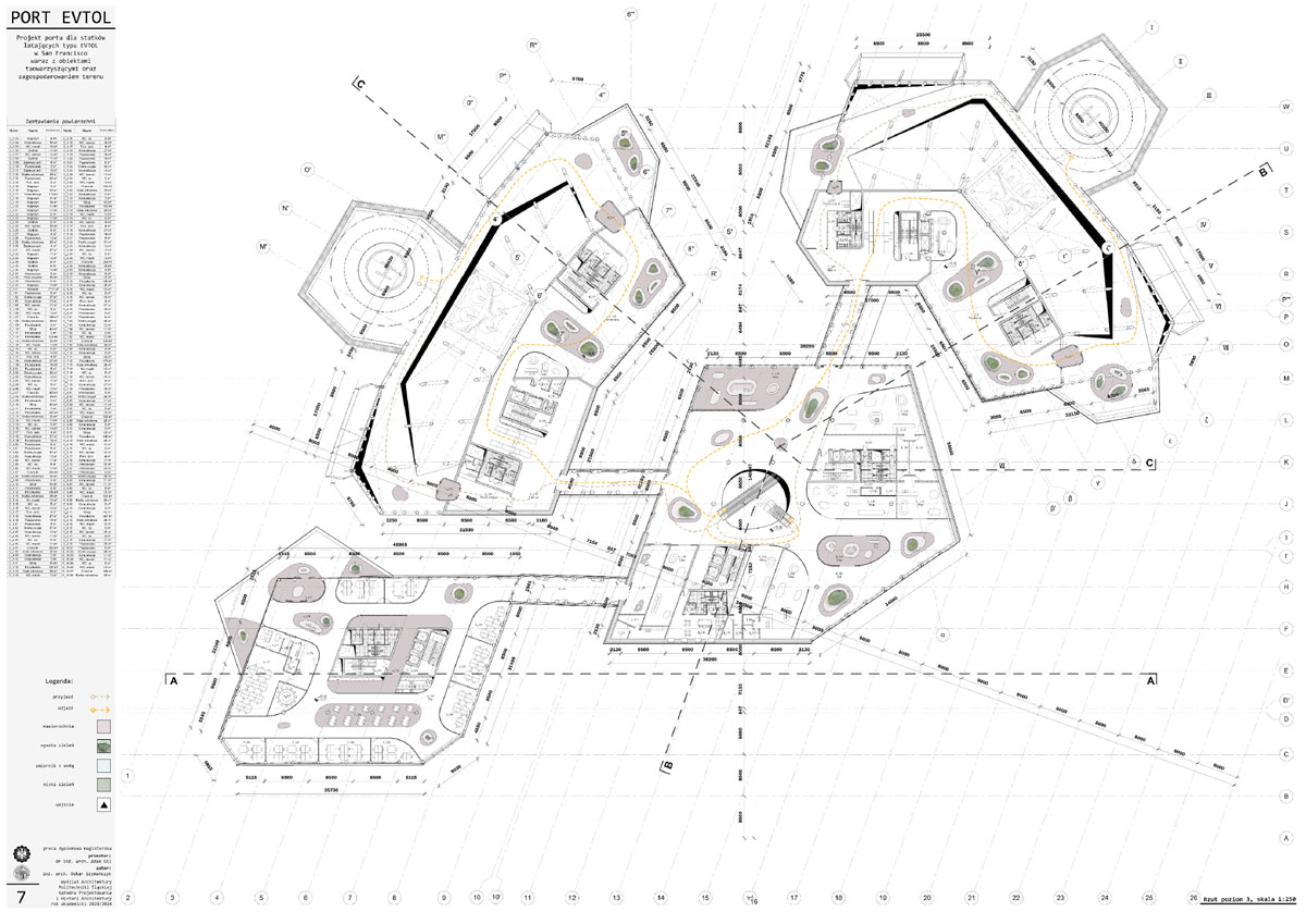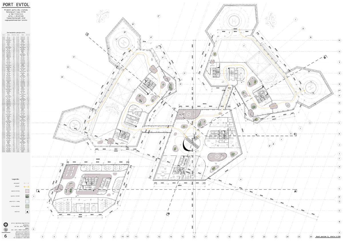 Tytuł: Projekt obiektu transportu publicznego. Portu dla statków powietrznych typu EVTOL w San Francisco wraz z obiektami towarzyszącymi oraz zagospodarowania terenu.