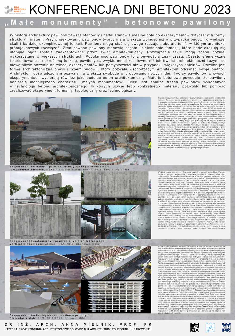 Podczas ceremonii zostały ogłoszone wyniki konkursu na najlepszy poster Dni Betonu 2023. Wyróżnienie drugiego stopnia i nagrodę 1000 zł otrzymała Pani Profesor Anna Mielnik – poster „Małe monumenty – betonowe pawilony”.